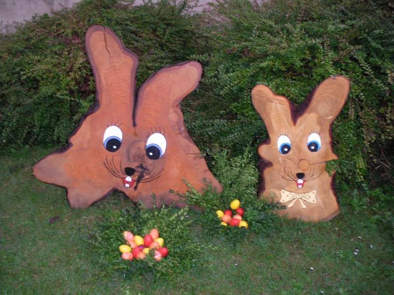 Die Osterhasen sind Teil des Osterbrunnens in Osternohe-Dorfmitte.